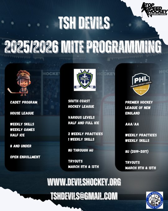Cadet Program - Ages 8 and under, learn to play with structure skills and player development as well as small games/half ice competition at New England Sports Village.